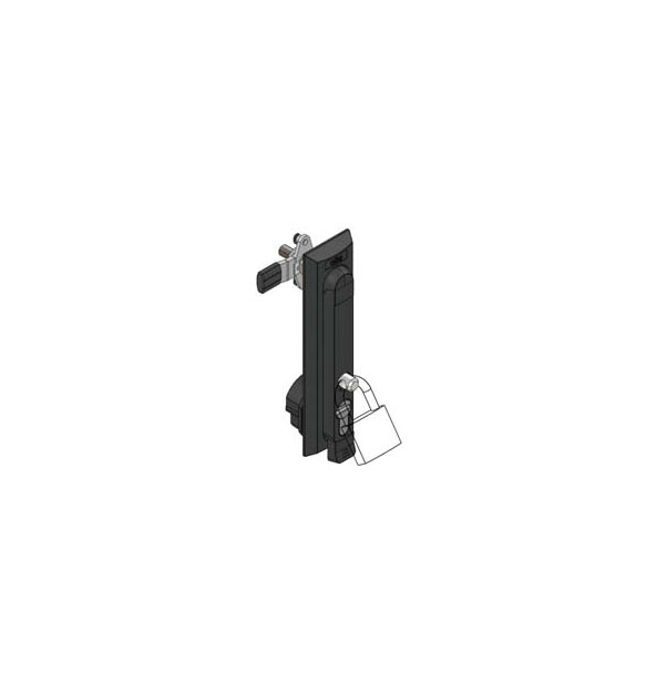 Corpo e maçaneta em zamac epóxi preto. Inserto em zamac cromado. Travamento reversível em zamac zincado. Lingueta TP45 (por lingueta) e lingueta LP45 (por varetas e lingueta) em aço zincado.